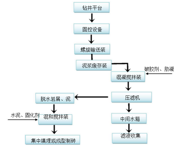 西安華揚油氣設備有限公司此工藝主要流程為:將鉆井過程中排放的廢棄泥漿通過泥漿收集箱,用泵提升送至巖屑緩存裝置,用泵提升至破乳混凝罐,用干粉投加機定量加破乳、助凝藥?;炷河商沾呻p缸泵抽至撬裝隔膜壓濾機進行固液分離,分離出來的泥餅由皮帶輸送機輸送出壓濾單元,濾液進入后續(xù)凈化處理裝置。